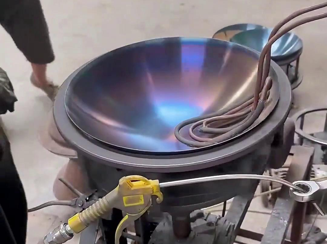 高頻感應加熱設備在鐵鍋烤藍工藝中的應用,是一種高效且環保的熱處理方法。烤藍是指在鐵鍋表面形成一層藍黑色的氧化膜,這層氧化膜可以提高鐵鍋的耐腐蝕性,同時賦予其獨特的美觀外觀。傳統的烤藍方法可能涉及化學處理或明火加熱,而高頻感應加熱則提供了一種更為先進和控制精準的解決方案。