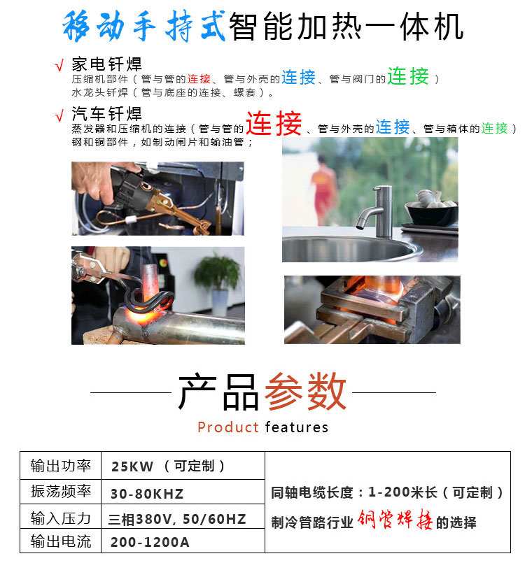 别名Q高频感应加热设?/br> 型号QHT-SC-40-A ?sh)压Q?80V 功率Q?0-40kw 用途:手持式高频加热机的主要用?、材料焊接,多用于多U材料的焊接Q如金属、铝、铜、不锈钢、铁{钎焊?、热处理Q多用各c金属^面表面淬火退火去应力{热处理工艺?/br>
